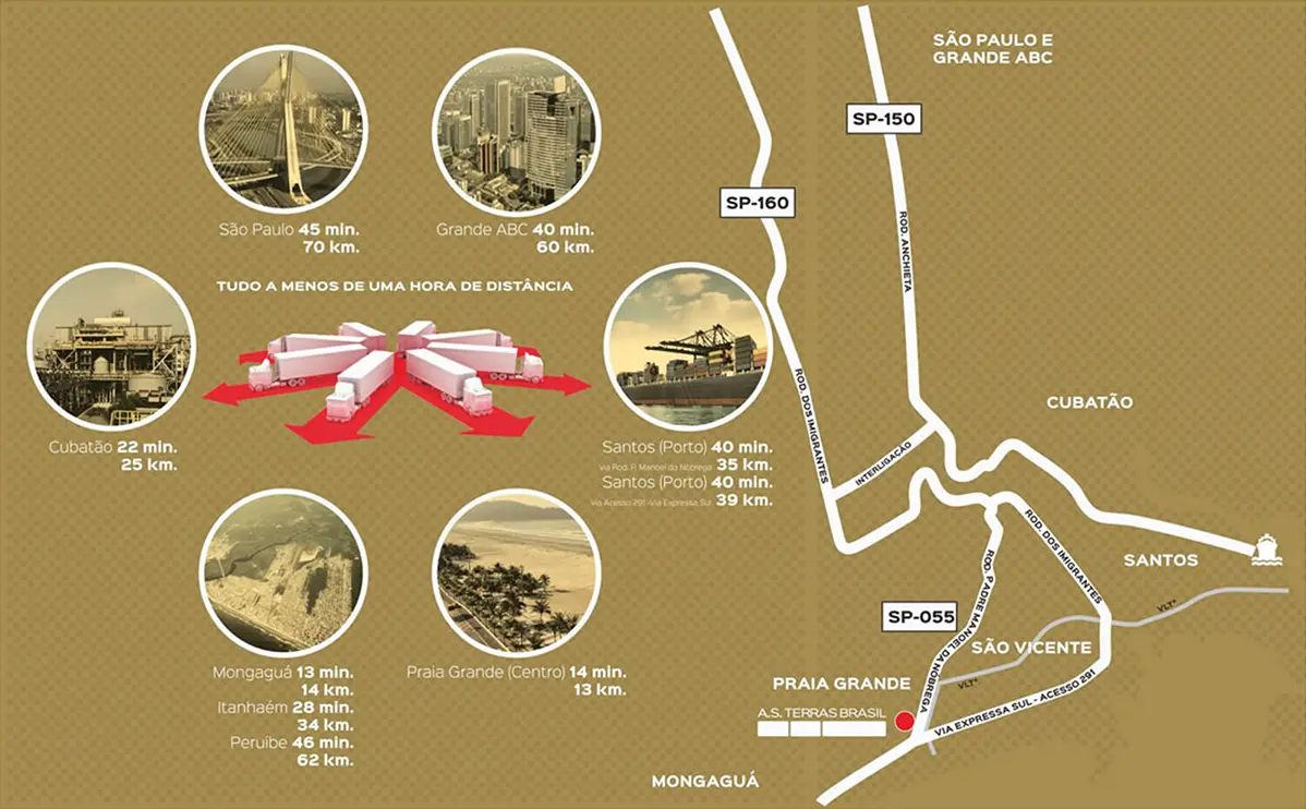 Com uma localização estratégica e privilegiada, o A. S. TERRAS BRASIL provê fácil acesso as demais cidades do Litoral Sul de São Paulo e as rodovias Padre Manoel da Nobrega, sistema Anchieta Imigrantes, principais rotas de saída para o porto de Santos, Cubatão, São Paulo e Grande ABC.